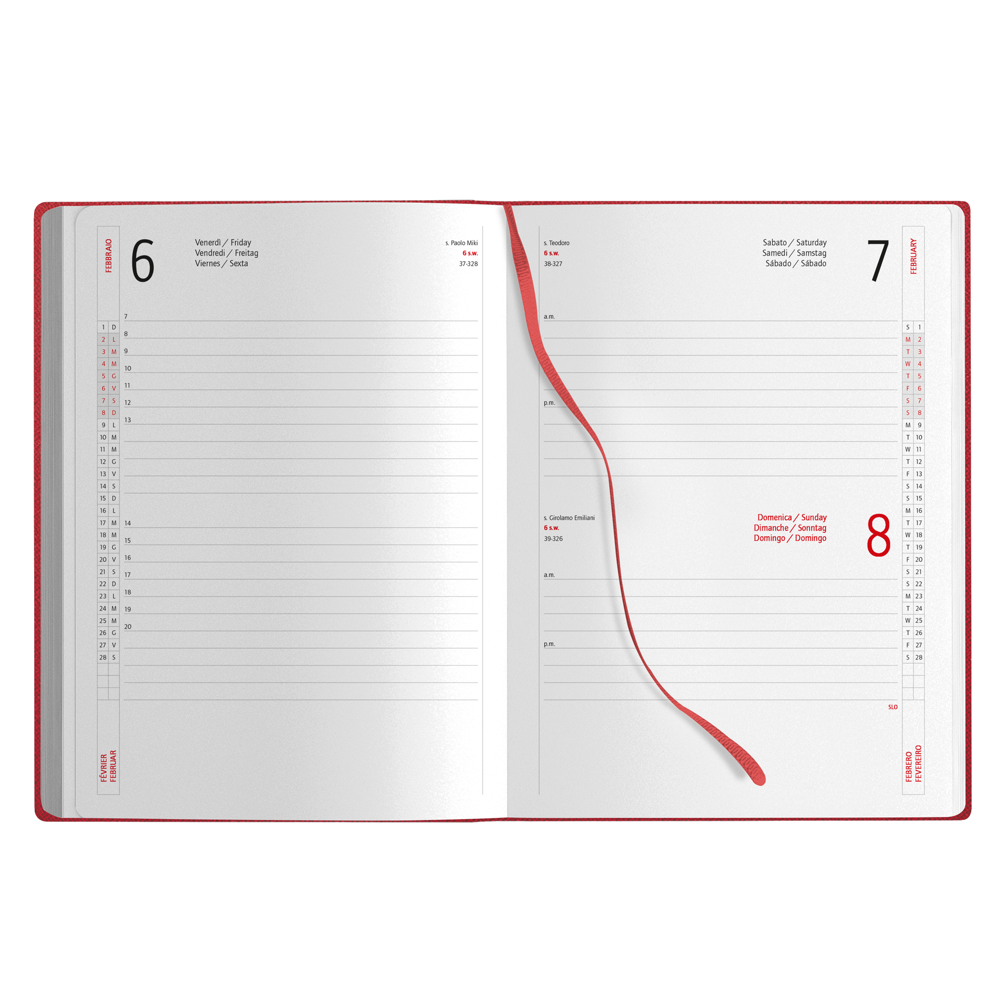 Agenda giornaliera da tavolo a blocco fisso in edizione multilingue. Ampia tasca nella copertina, interno in carta bianca con sabato e domenica su unica pagina. Inserto cartografico,rubrica telefonica e segnapagina. Copertina in poliuretano con stampa del millesimo. Disponibile in 5 colori diversi.Confezione in astuccio.